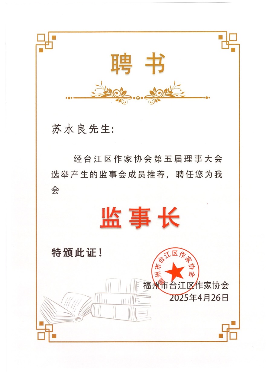 蘇水良當(dāng)選第五屆福州市臺江區(qū)作家協(xié)會監(jiān)事長