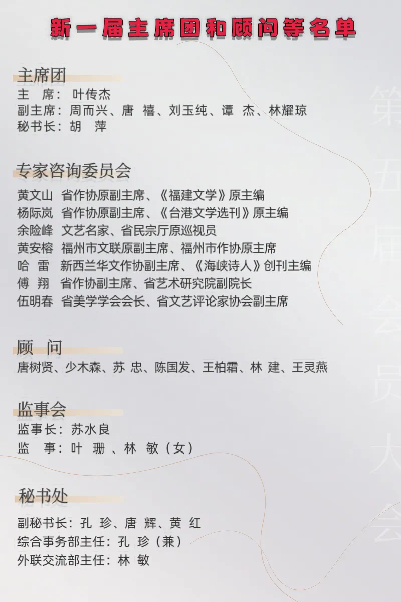 出席本次會員大會的,有國內(nèi)文藝名家、福建省民宗廳原巡視員余險(xiǎn)峰,福建省作協(xié)原副主席、《福建文學(xué)》原主編黃文山,福建省作協(xié)副主席、福州市作協(xié)主席余岱宗,福州市文聯(lián)原副主席、福州市作協(xié)原主席黃安榕,臺江區(qū)文聯(lián)原主席葉發(fā)永等領(lǐng)導(dǎo)嘉賓。