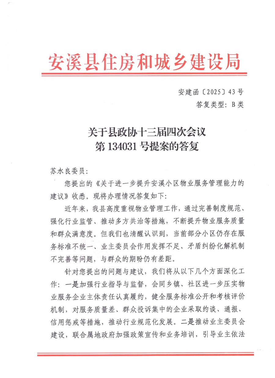 安溪縣住房和城鄉(xiāng)建設(shè)局關(guān)于安溪縣政協(xié)十三屆四次會(huì)議第134031號(hào)提案的答復(fù)