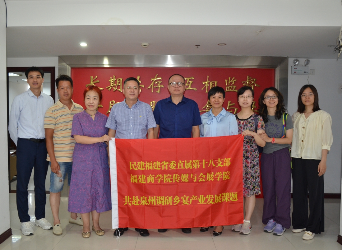 2025年7月1日,民建福建省委直屬第十八支部和福建商學(xué)院傳媒與會(huì)展學(xué)院組成的泉州鄉(xiāng)宴產(chǎn)業(yè)發(fā)展課題聯(lián)合調(diào)研組在南安市民主黨派服務(wù)中心會(huì)議室召開(kāi)“成功家宴”產(chǎn)業(yè)發(fā)展座談會(huì),民建南安市委會(huì)專職副主委陳素蓉,民建福建省直工委會(huì)秘書(shū)長(zhǎng)黃畊晗,民建福建省直工委委員、民建福建省委直屬第十八支部主委蘇水良,活動(dòng)委林新拓,會(huì)員粘在。福建商學(xué)院傳媒與會(huì)展學(xué)院網(wǎng)絡(luò)與新媒體系主任周晨芳、副教授楊斌、副教授魏揚(yáng)赟,傳媒與會(huì)展學(xué)院會(huì)展系主任金珊合影留念。