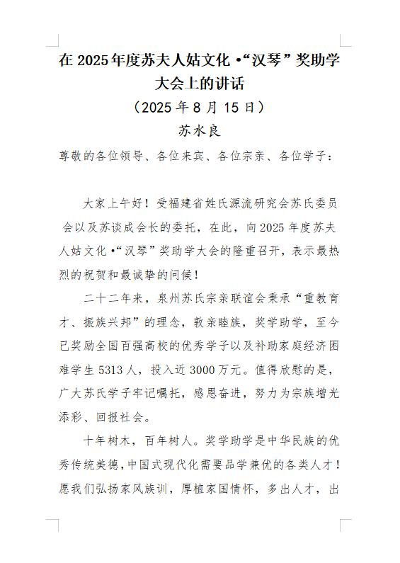 蘇水良在泉州蘇氏2025年度蘇夫人姑文化·“漢琴”獎助學(xué)大會上的講話